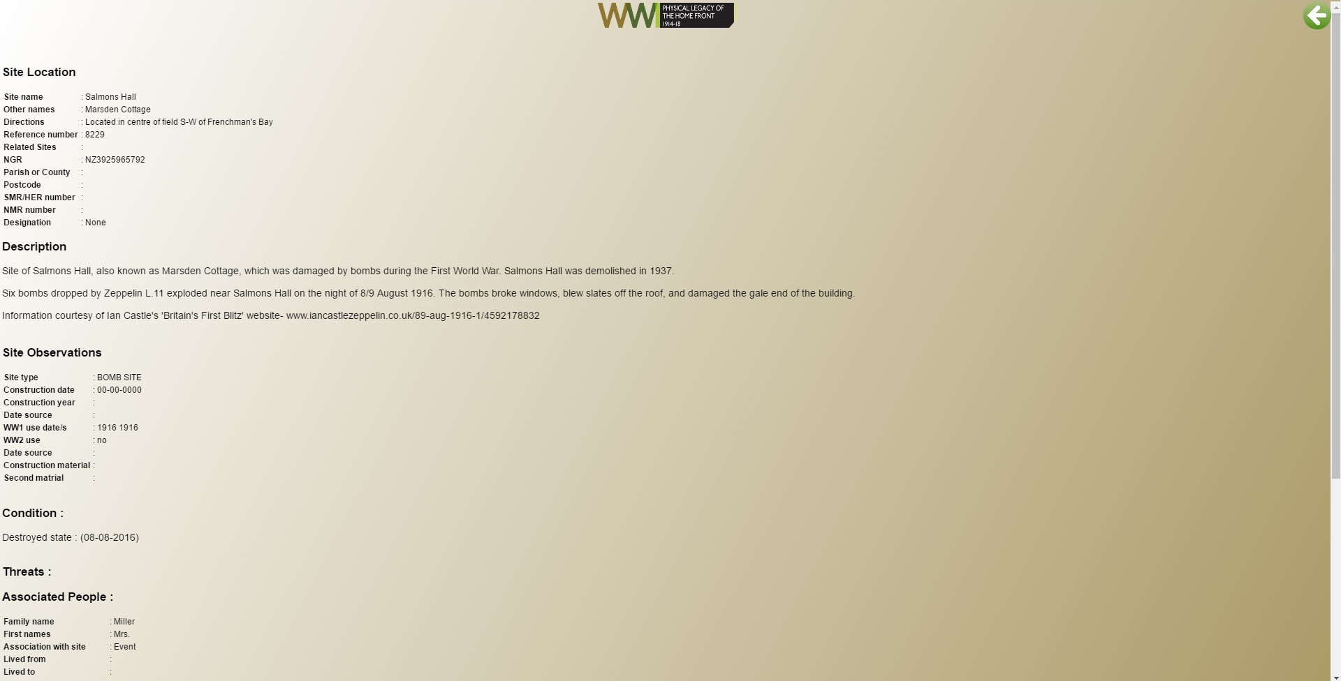 Site Description- Include as much information as possible in your site description. You may also include the history of the building in question or the details of the regiment manning Anti-Aircraft guns. The date of the air raid, the times the bombs fell and damage to the building are also useful pieces of information to include in your record. It is also very important to mention anyone killed or injured during the attack on your site, as this can help preserve the memories of those who suffered as a result of air raids.